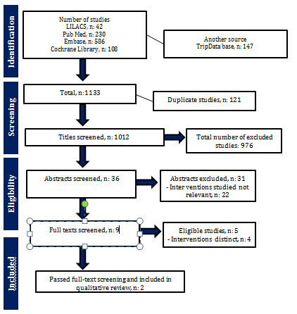 Figure 1 shows a flow chart of the study selection process. A total of 1133 studies were found. The Embase database returned the highest number of studies, 586, followed by the PubMed database (230 studies). The Lilacs, Cochrane Library, and Trip databases returned 317 studies. After the exclusion of 121 duplicates, the titles and abstracts of 1012 studies were analyzed for eligibility, regardless of language or publication medium, resulting in the exclusion of another 976 studies. (Thus, 36 studies would be fully read. In this phase only studies with the interventions (supervised x unsupervised) and population (only TKA patients) of interest remained, numbering five). Table 2 describes the characteristics of the five studies selected for the review of which three were from North America11–13 one was from Europe14 and one was from Oceania.6 The sample sizes varied from 70 to 240 individuals. Females prevailed in all studies, mostly aged 55 to 70 years.