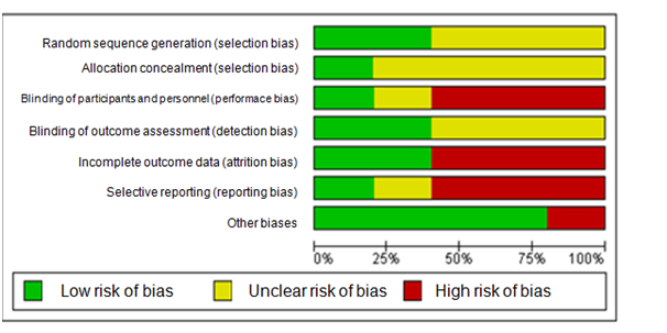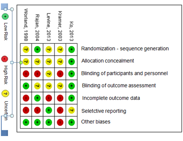 (Figures 2) (Figure 3) show the results of the internal quality assessment. Only two studies detailed the random sequence generation process6,14 presenting low risk of bias. The other three studies did not describe the random sequence generation process clearly.11–13 Only one study described allocation concealment correctly.6 The other studies did not provide a full description11–14 resulting in unclear risk of bias. Blinding of participants and personnel determines performance bias. Only one study described this methodological step.6 Levine et al.11 did not detail this step, presenting unclear risk of bias. Three studies12–14 did not mention this item, resulting in high risk of bias. Detection bias is avoided by blinding the outcome examiners. Two studies described this procedure well6,13 minimizing the risk of bias. Three studies11,12,14 described this procedure superficially, resulting in unclear risk of bias. Attrition bias is analyzed by accounting for the existence of incomplete outcomes. Two studies presented all the outcomes, so they were characterized as having low risk of bias for this item.6,14 However, three studies did not clarify the study outcomes, which resulted in high risk of bias.11–13 Reporting bias regards selective revealing or suppression of information by subjects. Only one study11 cited the outcomes, resulting in low risk of bias for this item. Ko et al.6 described this item inconclusively, resulting in uncertain risk of bias. Three studies8,15,16 did not describe this item clearly, resulting in high risk of bias. Finally, four studies6,11,13 did not seem to have other sources of bias. However, Kramer et al.12 changed their study design, resulting in high risk of bias.