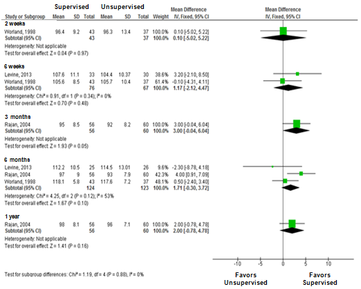 The data of interest included supervised and unsupervised physical therapy sessions conducted at a clinic or at home. The instructions for the unsupervised interventions were provided by e-mails, exercise brochures, and lessons. Four studies compared supervised and unsupervised interventions (two groups).11–14 Only one study investigated three physical therapy modalities: supervised individual therapy, supervised group therapy and unsupervised home therapy.6