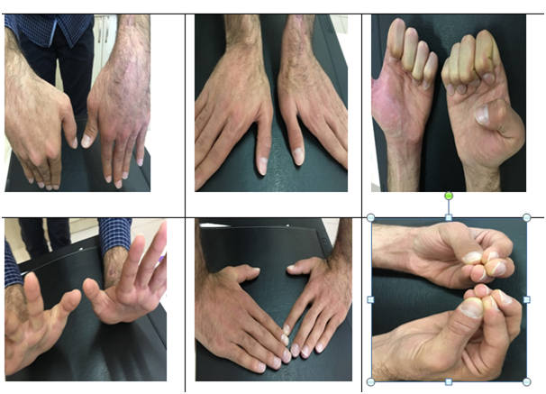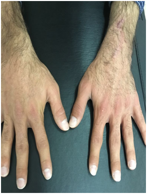 A 23-year-old male patient who was suffering from severe pain and limitation of movement on the left hand and wrist presented to our clinic. The patient’s complains were started 18 months ago. After surgical intervention for avascular necrosis 45 days ago he used casting for 30 days. After surgery the pain has turned out to be more severe and burning. On the physical examination, there was nearly complete limited range of motion on the entire movements of the left wrist, metocarpophalangeal, proximal interphalangeal, and distal interphalangeal joints. Furthermore, especially dorsal redness, thin, shiny, moist skin, increased heat and increased hair on the left hand was detected (Figure 1). There was patchy osteopaenia particularly in the peri-articular regions (Figure 2). With the diagnosis of complex regional pain syndrome type-1 calcium 1000 mg / day, cholecalciferol 800 IU/day, naproxen sodium 750 mg / day and gabapentin 1800 mg / day was started. A rehabilitation program was started including TENS, contrast bath, electrical stimulation and exercise program. After 4 weeks of treatment, the patient's pain was completely reduced. Wrist and other hand joint movements were completely turned out to be normal (Figure 3). Written consent of the patient has been obtained.