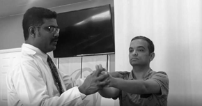 VOR cancellation: In the seated position the patient was asked to raise both arms up to shoulder height with the thumbs pointed up and the patient was asked to look at the thumb nail. While the eyes maintained focus on the thumbs, the arm was made to rotate left and right, subsequently moving the eyes, head, and thumb all together Figure 2. Provocation of dizziness may suggest a cerebellar involvement. No dizziness was provoked on testing.