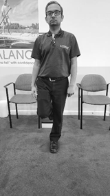 Single leg stance: The patient was made to stand unassisted on one leg, timed from the time the other foot left the ground till when the foot touched the ground again Figure 4. If unable to stand for 5 seconds or more it is considered the patient is at a greater risk of a fall. The patient was able to sustain this position for more than 5 seconds.