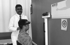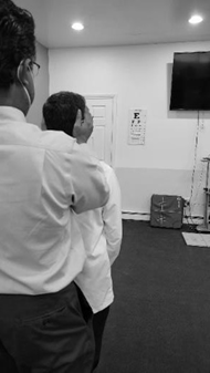 Static and dynamic visual acuity test: The patient was asked to read an eye chart in a static position and then he was asked to move the head side to side at a 2 Hz frequency Figure 6. More than a 3 line drop in identifying the letters and numbers with dynamic head movement suggest peripheral vestibular hypofunction. The patient exhibited a 1 line drop.