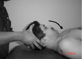 This test was done to differentiate the cause of the dizziness originating from a vestibular versus a cervicogenic source. For a cervicogenic source, the head was stabilized by the clinician and patients trunk was rotated. For a vestibular source, the head and trunk were rotated together Figure 11. Provocation of dizziness was noted. There was provocation of dizziness on combined head and trunk rotation.