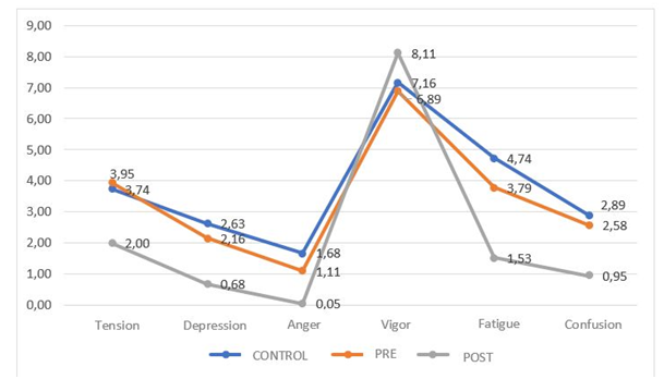 Figure 2 shows the state of control mood, pre and post intervention, in which the iceberg profile is observed, with low scores on negative aspects of mood and high on vigor.