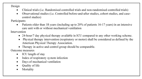Despite the comprehensive search strategy used, we could not identify ongoing or completed clinical trials comparing the interventions of this review. This is similar to the findings of two other recent reviews that have confirmed the lack of studies comparing the effect of the PT intervention according to the hours PTs are available in the ICU.20,25 It was also reported that due to a lack of good quality randomized controlled trials and inconsistent outcome measurement, there is insufficient evidence to support beneficial effects of PT intervention delivered post-ICU discharge.20 Probably, the lack of standardization of the interventions8 as well as the dose in terms of intensity, duration and frequency7 are the main factors for not detecting an effect on these outcomes, and more studies are needed to particularly assess appropriate dosage and timing of therapy.4,25