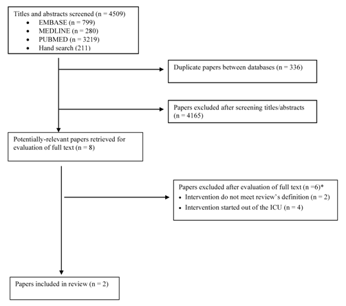 The electronic search strategy identified 4509 papers, of which 336 were duplicates, and eight were retrieved in full text and screened for eligibility (Figure 2). 4165 studies were excluded after revision of titles and abstracts for failing to meet more than one inclusion criteria. A systematic review15 of additional physiotherapy to hospital inpatients outside of regular business hours was identified by the search. Screening of the reference list identified one article potentially eligible,16 but it was excluded because intervention started out of the ICU. No clinical trials were found, and two observational studies met the inclusion criteria, which were included in the review. One of them was grey literature (i.e. MSc dissertation); therefore, it was necessary to ask the authors for access to the full-text document.