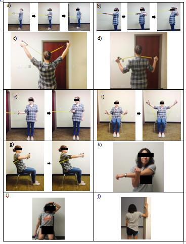 Exercise intervention: The exercises program included stretching of the chest, neck, and posterior shoulder muscles, and strengthening exercises that target rotator cuff and muscles around the scapula (Figure 1).24,30,37 All exercises were performed using resistive bands (Theraband®, Hygenic Corporation, Akron, OH) so that the exercises can be performed in any setting. Four levels of resistance bands were used to perform the exercises. The yellow, red, green, and blue resistive bands provided the lowest to highest amount of resistance. At the beginning of the program, each participant selected the appropriate level (color) of resistive bands to be used for each exercise. The appropriate level of resistive band was determined as the band with the highest resistance that participants could use to complete 10 repetitions of the exercise. We used a card that indicated the band color to be used for each exercise. The participants wore the card around his or her neck while performing the exercises, in order to keep track of the appropriate band color for each exercise. During the first 3 weeks (wk1-3), the participants performed 3 sets of 10 repetitions of each exercise, while focusing on the technique and gradually increasing resistance. The repetitions were increased to 12-15 over the next 2 weeks (wk4-5) and to 15-20 over the last 2 weeks of the program (wk6-7). Each stretching exercise was held for 15 seconds, and was repeated three times on each side. In addition to performing the exercises in the program twice a week, the participants were encouraged to perform the exercises at least once during a week on their own using the resistive bands provided. Attendance was taken during each session, and days on which the participants performed exercises on their own at home were recorded on the journal that they kept as a part of the program.