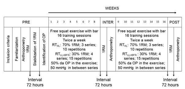 Participants in HLRT and LLRT+BFR underwent three weeks of familiarization, followed by 16 weeks of training with free squatting exercise with bar twice a week, with a 72-hour interval between sessions. Figure 1 shows the scheme of tests and the order for each of the measurements performed during the experimental period.