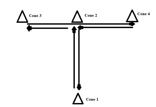 The T-test is a valid, reliable and commonly used agility test amongst soccer populations18,19 and is depicted in the Figure 1. Participants were asked to sprint forward from a stationary position (cone 1) to a cone 10 yards away (cone 2), side shuffle to a cone 5 yards to the left (cone 3), side shuffle to a cone 10 yards to the right (cone 4), side shuffle back to the central cone to the left (cone 2), and then back-peddle to the start position (cone 1) as fast as possible. A Brower TC Timing System was used to measure agility times to one hundredth of a second.