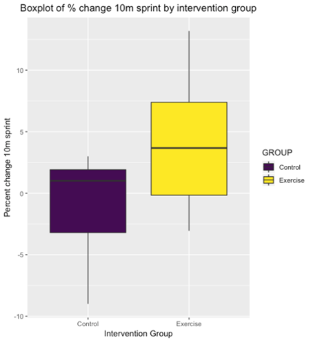 The 11+ group yielded a mean percent change in 10m sprint times of 4.13 while the control group produced a mean percent change -1.08. The p-value for the Mann-Whitney U test between intervention groups for the 10m sprint was 0.189. A p-value of 0.329 was obtained following a secondary sensitivity analysis. Sprint % change by group is depicted in the Figure 2.