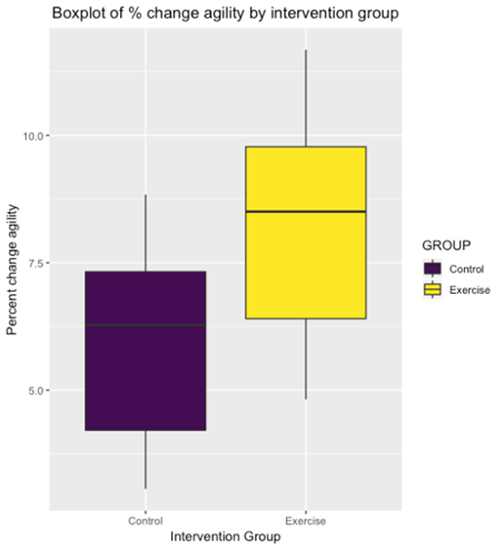 Agility testing yielded a mean percent change of 8.18 for the 11+ group while the control group produced a mean percent change of 5.89. The p-value for the Mann-Whitney U test between intervention groups for the agility T-test was 0.072. The secondary sensitivity analysis yielded a p-value of 0.082. Agility percent change by group is depicted in the Figure 3.