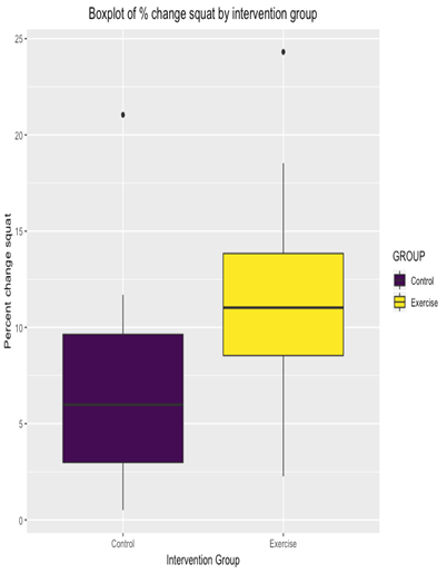 The 11+ group yielded a mean percent change of 11.88 for the squat jump while the control group produced a mean percent change of 7.54. The Mann-Whitney U test between intervention groups for the squat jump yielded a p-value of 0.152. A p-value of 0.1775 was achieved following the secondary sensitivity analysis. Squat jump percent change by group is depicted in the Figure 4. Across all three tests, positive mean percent change values denote a favorable but non-significant increase in jump height.