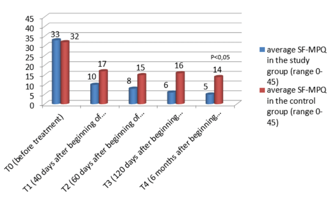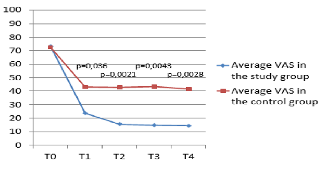 As regards the primary endpoint, i.e. the intensity of pain measured using a visual-analog scale (VAS) in a range from 0 mm (no pain) to 100 mm (maximum pain), the average values of the VAS at T0 were almost identical in the two groups of patients, in particular in the study group the mean VAS at T0 was equal to 73.4 (with standard deviation, SD: 12.5) and the mean VAS at T0 in the control group was equal to 72.6 (with standard deviation, SD: 11.1). The mean VAS values at T1 were equal to 23.7 in the study group (with SD: 10.6) and 43.1 in the control group (with SD: 7.3), at T2 they were equal to 15 .4 in the study group (with SD: 8.4) and 42.8 in the control group (with SD: 8.2), at T3 they were equal to 14.8 in the study group (with SD: 9, 1) and 43.4 in the control group (with SD: 10.3), at T4 they were equal to 14.5 in the study group (with SD: 10.2) and 41.7 in the control group (with SD: 9.7). These values are summarized in the relative graphic (Graph 1).