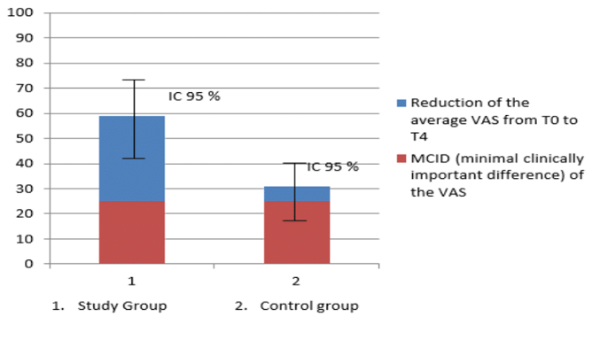 In the context of the analysis of the data obtained, it was analyzed, beyond statistical significance, what was the actual clinical relevance of the differences in the two treatment groups. Taking into account the reduction in VAS and in particular the difference between the mean pre-treatment VAS value and the mean VAS value at the last follow-up in each of the two groups, the 95% confidence interval (95% CI) of the obtained values was calculated and compared with the minimally clinically important difference (MCID) of the VAS which - on the basis of what is reported in the scientific literature16,17can beconsidered equaltoadecreaseof25 mmofthescore.
