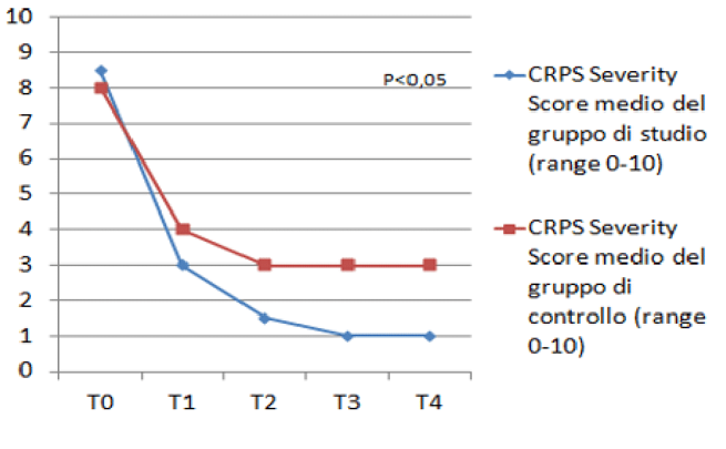 Results: With regard to the primary endpoint of the study, i.e. pain intensity measured by means of a visuo-analogue scale (VAS) in a range from 0 mm (no pain) to 100 mm (maximum pain), the results show a more significant reduction in the mean VAS in the study group compared to the control group. The collected data were then statistically analysed and comparisons between the means were performed by analysis of covariance (ANCOVA). The p-values obtained were in all cases below the initially established statistical significance level of α=0.05. These results are in line with those obtained for the secondary end-points, i.e. the McGill Pain Questionnaire Short-form (SF-MPQ), the CRPS Severity Score, the functional assessment questionnaires for the affected limb (Quick DASH for the upper limb and LEFS for the lower limb), the SF-12 questionnaire for the assessment of the patient's quality of life: the latter highlight a significant improvement of the "functional" endpoints in the study group compared to the pre-treatment values and above all highlight the existence of a relevant difference in the comparison between the two groups of patients, with evidence of greater therapeutic efficacy in terms of recovery of function and improvement of quality of life in the study group compared to the control group.