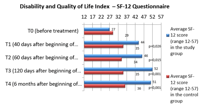 The results highlight a significant improvement in the "functional" endpoints in the study group compared to pre-treatment values and above all highlight the existence of a significant difference in the comparison between the two groups of patients, with evidence of greater therapeutic efficacy in terms of recovery of function and improvement of quality of life in the study group compared to the control group.