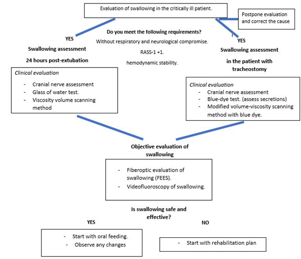 VMAD is underdiagnosed within the ICU, however, it should be noted that there is an incidence of 3% to 62% in post-extubated patients and 50-84% in tracheostomized patients, therefore, it is crucial to carry out an early evaluation and timely for the detection and care of patients with dysphagia.1 According to scientific evidence, the optimal time to assess swallowing is 24 hours after the orotracheal tube was removed, in order to allow recovery of the swollen structures and observe that extubation has not failed. In relation to the tracheostomized patient, it should be noted that the evaluation of swallowing must be directed according to the objectives. In the patient with prolonged mechanical ventilation, it is safe and feasible to be able to carry out an objective evaluation of swallowing only if the deflation of the tracheostomy cannula pneumotamponade balloon is tolerated. However, it is important to assess whether it is possible to wean from mechanical ventilation in the first instance. If he does not require mechanical ventilation but has a tracheostomy, it is necessary to assess whether he has adequate secretion control and, at the same time, assess his oral nutrition subjectively and/or objectively.2 It is important to take decannulation into account as the first objective before a dietary implementation, however, it may be safe to start with an oral diet in the patient who has a tracheostomy cannula for a long time, as long as a pertinent evaluation is made.3 (Figure 1) it is important to assess whether it is possible to wean from mechanical ventilation in the first instance.