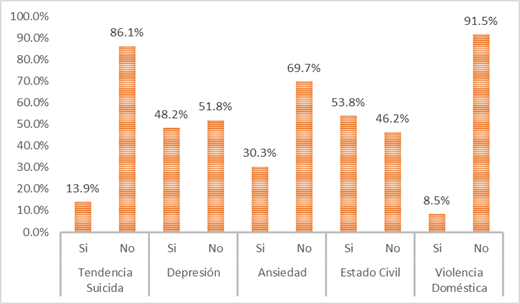 Descriptive results were obtained first, in which it can be seen that 13.9% of the population have a suicidal tendency, 48.2% have depressive symptoms, 30.3% have anxiety symptoms, 53.8% are married or cohabiting, and only 8.5% have been victims of domestic violence by their partner. The general frequencies of each of the 5 study variables can be seen in Figure 1. Likewise, in the bivariate analysis between the suicidal tendency (dependent variable) and the other independent variables; it was more relevantly observed that of all the patients with suicidal tendency, 87% also coincided with depressive symptoms; that 72.9% of patients with suicidal tendencies also had symptoms of anxiety; that 51.8% of the patients with suicidal tendencies were married or cohabiting; and that 12.1% of patients with suicidal tendencies suffered from domestic violence by their partner. The detailed analysis can be seen in Table 2.