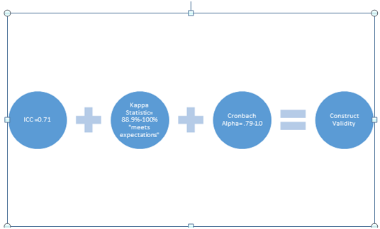 The Cronbach’s alpha (internal consistency) values range from.79-1.0 and were evaluated through analysis of percent agreement values, which represented scores of 3 or greater. With the values for percent agreement ranged from 88.9%-100%, with an ICC value at .71. This combination provides excellent foundation for overall strong construct validity for each of the questions rated by our experts.