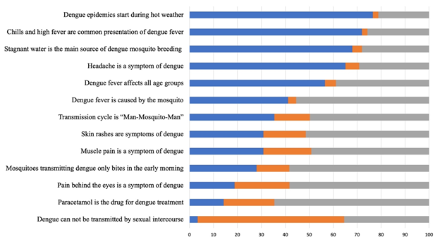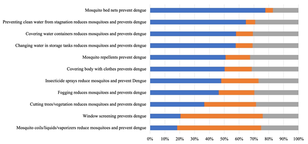 Figure 2 illustrates the percentage of knowledge of prevention regarding dengue fever in X-axis and the statements related to the knowledge of preventive measures of dengue fever. The color blue indicates that the participants responded “Yes” to the statement, orange indicates “No” and gray indicates “Doesn’t know”.