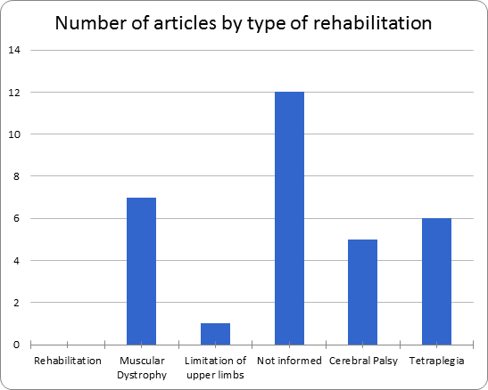 Figure 3 shows the number of items found depending on the type of rehabilitation, which were: muscular dystrophy, limiting the upper limbs, cerebral palsy and tetraplegia. But unfortunately, most of the works selected for the systematic mapping did not report the type of rehabilitation used to use computer vision to control wheelchairs.