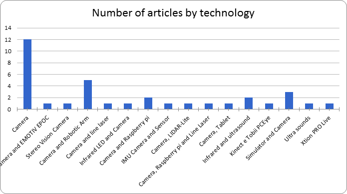 Camera and infrared LED; camera and raspberry pi; camera and IMU sensor; camera and LIDAR-Lite; camera, raspberry pi and line laser; camera and tablet; infrared and ultrasound; Kinect and Tobii PCEye; simulator and camera; ultrasound; Xtion PRO Live. Thus, it is noticed that the camera was the most used equipment in the selected works on the theme researched this systematic mapping.