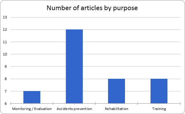 Figure 6 shows the number of found items according to the purpose of application of labor, namely: monitoring /evaluation, accident prevention, rehabilitation and training. In this sense, it can be observed that most of the work seeks to prevent accidents, since it is something very important for people who use wheelchairs, the elderly and people with disabilities, for example, to avoid further damage to your health.