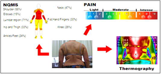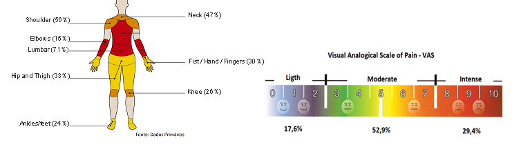 Records from NQMS affirmed that the main body regions stricken by pain e limitation were: lumbar 71%, shoulders 56% and neck 47%. Pain intensity registered by VAS was 17.6% of light pain, 52.9% of moderate pain and 29.4% of intense and limiting pain respectively (Table 1).