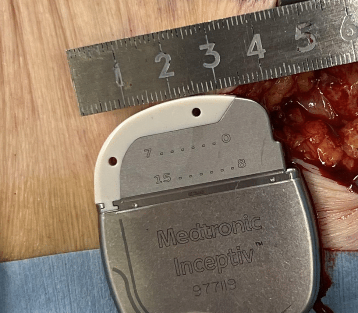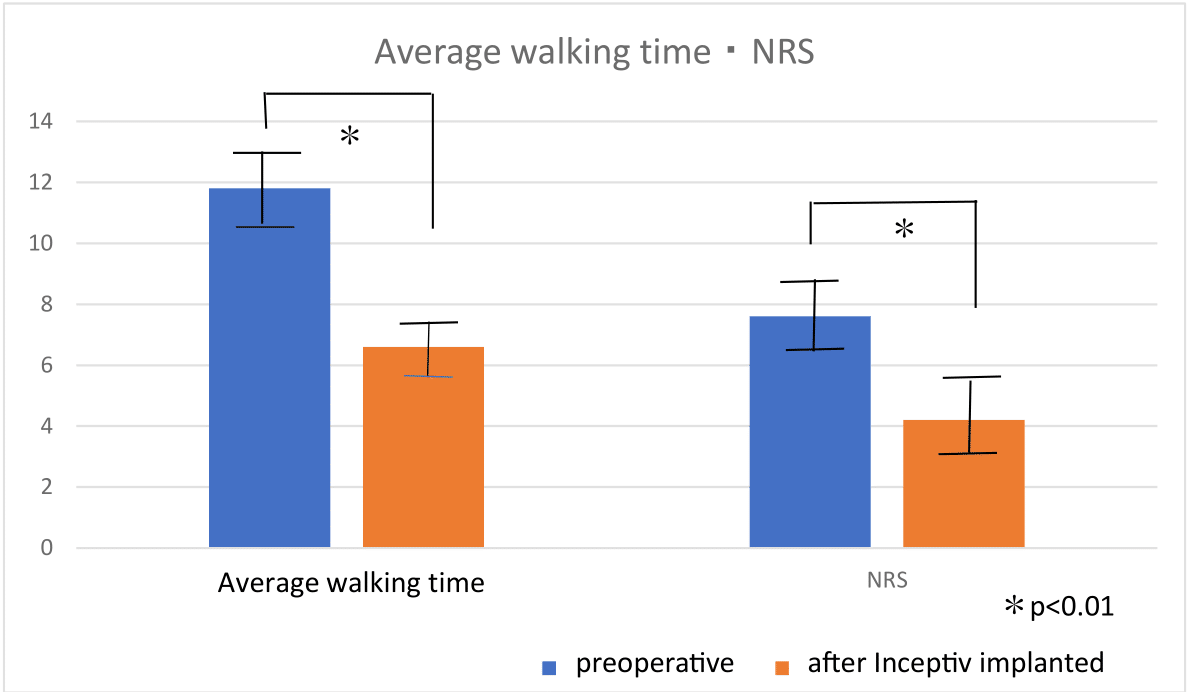 The average walking time significant improved from 11.8 seconds to 6.6 seconds, and the NRS score significant decreased from 7.6 to 4.2 Figure 3. Patient satisfaction was high, with four patients being very satisfied (5), one somewhat satisfied (4), and one neutral (3). Following the implantation of Inceptiv, uncomfortable electrical stimulation did not occur in 5 out of 6 patients.