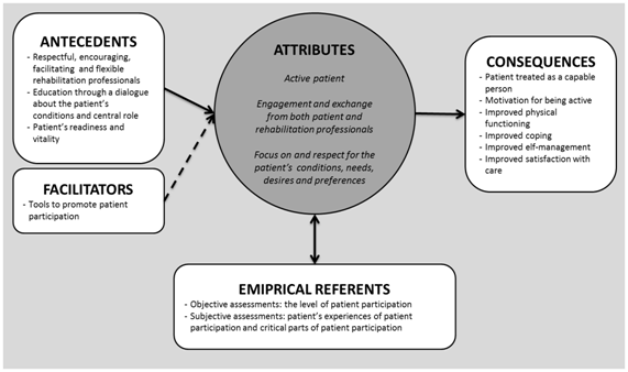 As there seems to be a non-common language this conceptual analysis can give support to what patient participation conceptually means. In order to provide clarity in how the concept of patient participation in physical medicine and rehabilitation is used; it assumes an active patient, engagement and exchange from both the patient and the RPs, and focus on the patient’s condition, needs, desires and preferences. The antecedents emerged from this concept analysis underpin the importance of RPs skills to promote actively participating patients. RPs must be empathic and respectful to the patient, provide information about both the patient’s condition and the rehabilitation process, as well as allow the patient to participate according to their individual needs and in a flexible manner.