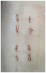 Wang considered PF as a good therapeutic option in type A thoracolumbar fractures, with significant differences between this technique and traditional open surgery, regarding incision size (Figure 1) blood loss, surgical time, hospitalization period, need for blood transfusion and postoperative analgesia. However, there were no differences between these two techniques regarding the radiological results obtained (Figure 2-6).13