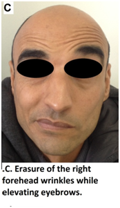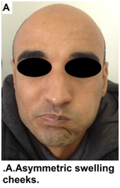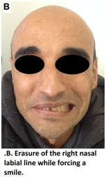 T.M is a 40 years-old man, previously healthy. He presented 7 days before his admission, a facial asymmetry, with swallowing disorders. These signs were evolving rapidly during a stay in a village. There was no history of migrant erythema, tick’s spot, or fever. The clinical examination found a right peripheral facial palsy (PFP) (Figure 1) hypoesthesia in the territory of the right Vth cranial nerve and hypokinesia of the right soft palate with dulled gag reflex. The clinical syndrome was unilateral cranial polyneuritis.