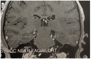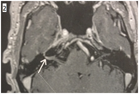 The cerebral MRI showed a Gadolinium enhancement of the right facial nerve above his emergence from the protuberance (Figure 2).