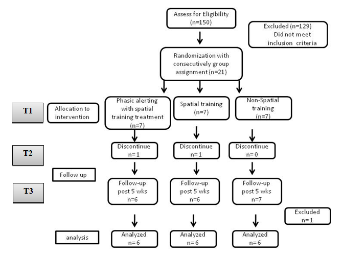 This study design was fashioned after the study of Frassinetti et al.,33 in which the effectiveness of prism adaptation in USN was examined. Our pilot study was designed to examine a novel intervention with new strategies for the treatment of USN. In this study, one of the researchers randomly assigned patients with USN into one of 3 groups. As the number of USN patients was not large and the number assigned to each group was to be equal, the following quasi-randomization method was used to form the groups. The first individual was assigned randomly to one of the groups (each group was given a number from 1-3, and similarly, a number from 1-3 was drawn for that patient). From that point on each new participant was assigned to the next group consecutively.