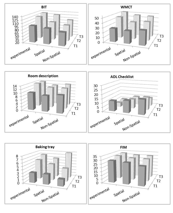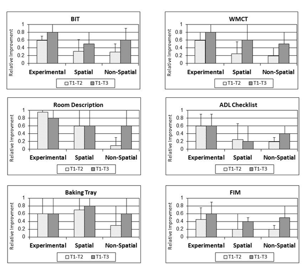 We compared the achievement of potential improvement by each group, as explained in the Methods section. The results (Table 2) (Figure 2) point to a distinct time course in the achievement of potential improvement by each group. The experimental group achieved more than 50% of its average potential for improvement during the two-week intervention period (T1-T2) in all measures except for the FIM. In contrast, the achievement of potential improvement during that time, by the non-spatial control group, was smaller than 50% in all measures. In the spatial control group, the improvement during the treatment period was smaller than 50% in all measures except for the Room Description and the Baking Tray.