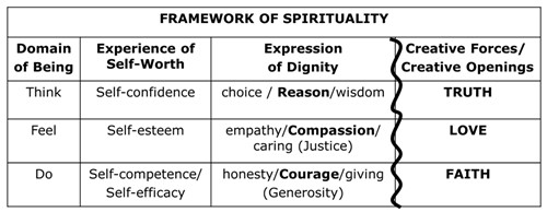Figure 1 This illustrates the theoretical Framework of Spirituality (FOS) beginning with the CBT elements of thoughts, feelings and behaviors, including the expansion to the distinction of self-worth, and the expression of dignity that expands socially as wisdom, justice, and generosity. The expansion to the Creative Forces/Creative Openings occurs as the spiritual core (??) is opened.