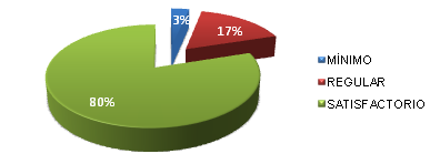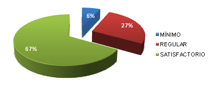 Interpretation: In the follow-up of the work of the CONFIDENCE Dimension (Social Skills of Beginning and Advanced Social Skills), of the 30 volunteer educators in 15 Municipal Children's Centers, it was registered in the Observation Guide; Participation with children and participation with mothers, parents and / or guardians. It was obtained that: 2 educators demonstrated to work with a minimum level of 6%; 8 educators demonstrated their work at a regular 27% level and 20 educators worked at a satisfactory level of 67% (Table 1) (Figure 1).