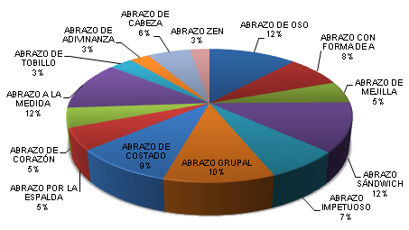 Interpretation: The work of the 30 educators from the Dimension BELONGING (Alternatives to Aggression Social Skills) was followed with the records in the Observation Guide of the Types of Hugs made, taking into account the frequency observed in the visits to the 15 Municipal Children's Centers: first, the frequency of the types of hugs carried out by the educators with the girls and boys in their corresponding rooms (infant and pre-school), second, the frequency of hugs carried out among girls and boys and finally the frequency of hugs of mothers, parents and / or guardians with the girls and boys at the moment of the entrance and exit of the infants to their corresponding Infant Center. The types of hugs most replicated by the educators were: Bear Hug, Sandwich Embrace and Embrace the Measure with 12% frequency; Group hug with 10% frequency; Embrace Side with 9%; Hug in A-shape with 8%; Impetuous hug with 7%; Hug Head with 6%; Embrace of Cheek, Back and Heart with 5%; and Embrace of Ankle, of Guessing and Zen with 3% of frequency replicated in the CIM in both working rooms of the educators (Table 3) (Figure 3).