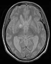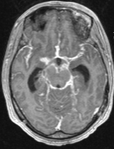 Figure 1 Brain MRI T1 with gadolinium contrast images, axial view - diffuse leptomeningeal enhancement with basal cistern involvement.