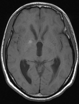Figure 3 Brain MRI T2 images, axial view - acute ischemic lesions with hemorrhagic transformation in the right globus pallidus and anterior limb of internal capsule consistent with infarctions due to infectious arteritis.