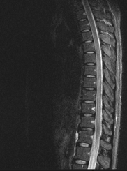 Figure 4 Spine MRI with gadolinium contrast, sagittal view - diffuse cervical, thoracic, lumbar and sacral enhancement of meninges overlying spinal cord.