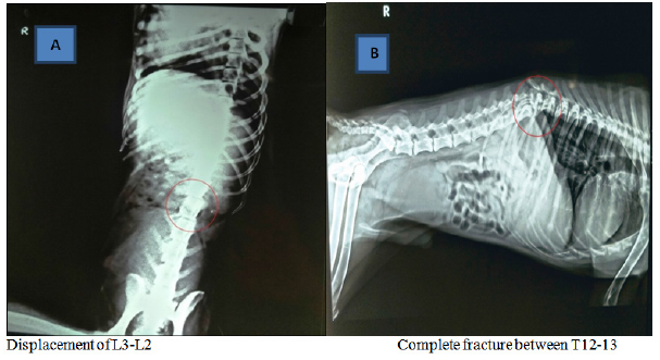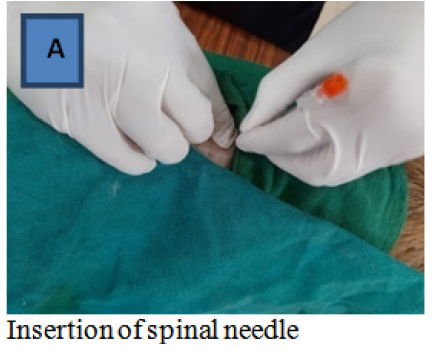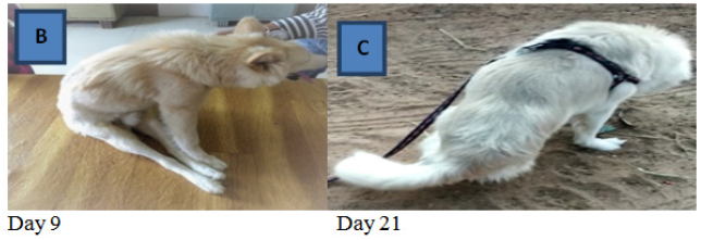 Spinal cord injury refers to trauma, that results in partial or complete loss of function (SCI - 2% out of which 60% were due to automobile accidents) symptoms ranges from ataxia to paralysis. Six (6) dogs having SCI presented at the Teaching Veterinary Clinical Complex, College of Veterinary Sciences and Animal Husbandry, Anjora, Durg (CG) during January to December 2019 were selected based on recovery from the acute trauma for repeated autogenous SVF therapy. All the animals were subjected to the standard line of the diagnostic protocol that includes patient history, physical neurological examination (included proprioceptive positioning reaction, visual placing reaction, nociception, withdrawal reflex, patellar reflex, perineal reflex, urinary control and followed by radiograph) (Bali, 2000). Initially animals with SCI were subjected to conservative treatment and rehabilitation therapy with SVF (intrathecally) on the day 14, 21, 28 and subsequent doses as per the recovery pattern. The details of patient data and clinical findings are presented in Table 1. Treatment protocols for the early reported cases of SCI included first-line care, involves the support of breathing and circulation, followed by an appropriate immobilization of the vertebral column to limit further damage of the spinal cord with the injection of corticosteroid methylprednisolone sodium succinate @ 5-10mg/kg bolus. Initial treatment with corticosteroid and analgesic followed by one to two weeks of treatment with multivitamin (mecobalamin, folic acid etc.) and gabapentin @ 5-7mg/kg in case of neurogenic pain was advised. After conservative treatment, patients were subjected to autogenic SVF therapy with due consent of owners. Following pre-anaesthetic and anaesthetic plans were adopted as per the behaviour of the patient.