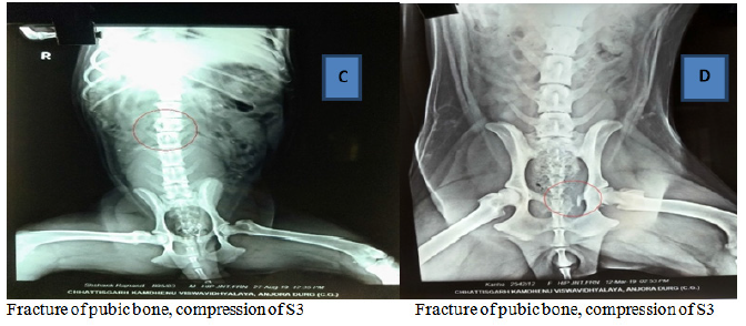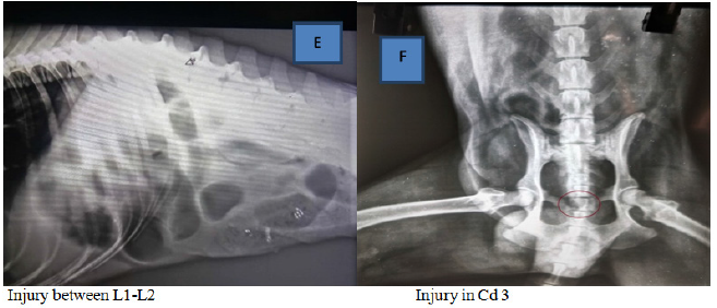 On survey radiography the patient were screened for the vertebral injuries as described in Table 1 and Figures 1A–1F, first case reflecting displacement of L3 in relation to L2, second case showed complete fracture between T12-13, third patient revealed compression in L3, fourth case had fracture of left pubic bone with compression of S3 and fifth and sixth case showed abnormality in both L1-2 and caudal 3 vertebrae. Plain radiography supports findings, formal interpretation for immobilizing the patient appropriately. The failure to adequately immobilize the spine owing to mechanism of injury diagnosis is a pitfall.9