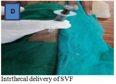 Intrathecal administration of the SVF: The site of injection was decided as per the radiographic findings and injection were administered with 100-200 µl of SVF at three locations (middle of the injury site and at proximal and distal margins) to depths of 3 mm by using a 30-gauge needle.5