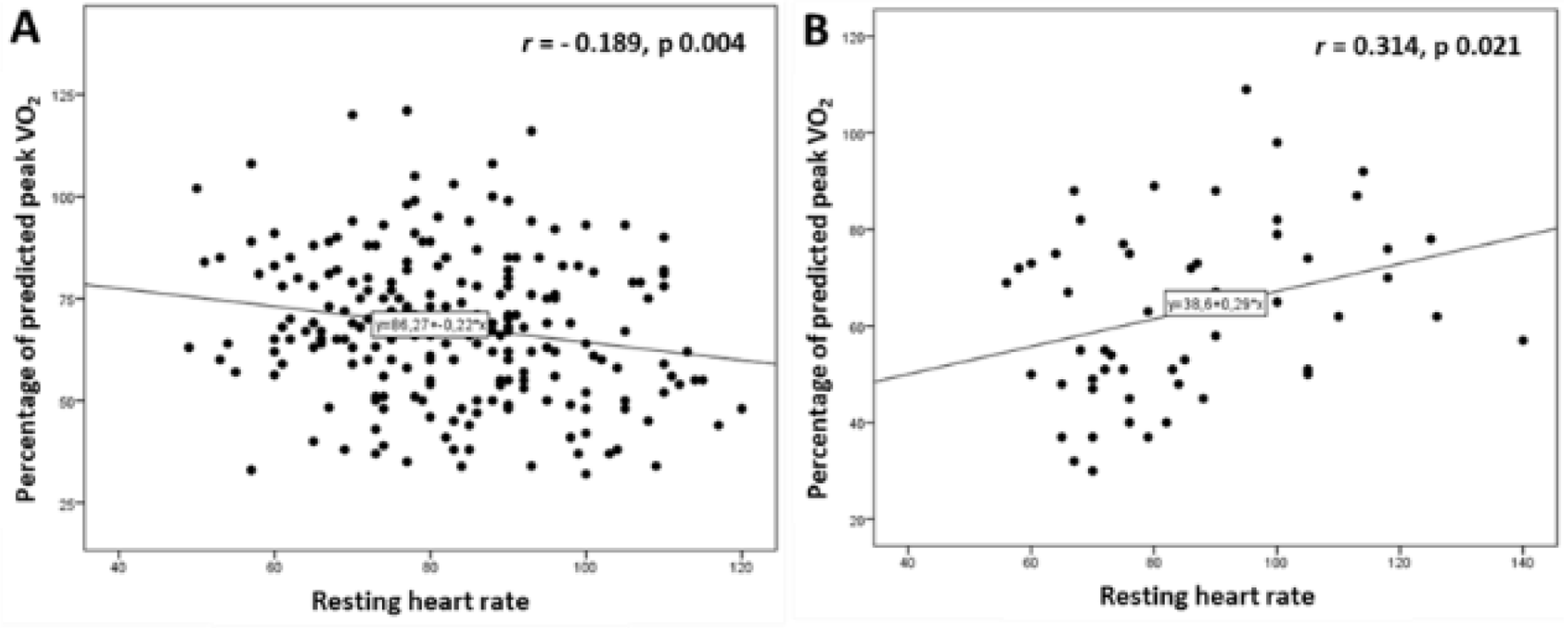 The relationship among resting HR and percentage of predicted pVO2 was statistically significant in the SR group, showing an inverse association between resting HR and exercise capacity (Figure 1A). In AF patients, there was also a statistically significant relationship among resting HR and percentage of predicted pVO2; however, this relationship was reversed as higher resting HR was related to better exercise tolerance (Figure 1B).