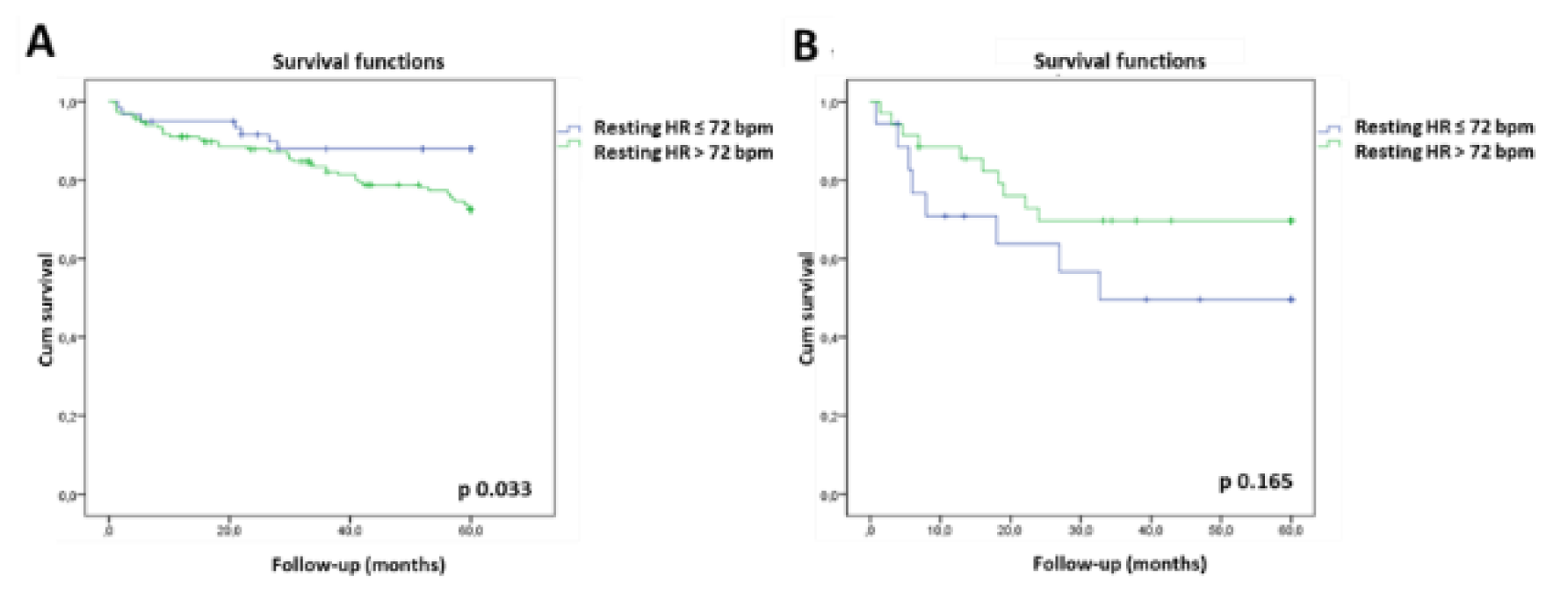 Results: In the patients enrolled (mean LVEF 27±7%), 19.1% had AF. The composite endpoint occurred in 24.4% during follow-up. There were no differences regarding maximal effort, but AF group had lower exercise capacity. In the SR group, there was an inverse relationship between resting HR and exercise capacity (r-0.189, p 0.004). In the AF group, this relationship was reversed as higher resting HR was associated with better exercise tolerance (r 0.314, p 0.021). Regarding outcomes, patients in SR with a resting HR higher than 72 bpm had higher risk of composite outcome than those with lower resting HR (p 0.033), but this was not evident in AF patients.