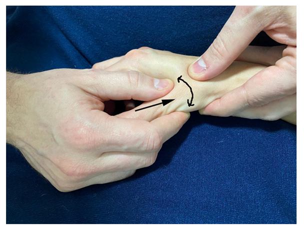 Shear test (Figure 3): The trapezium is stabilized with one hand, and the base of the first metacarpal is supported with the other hand. Then, the thumb is pressed in the medial and lateral direction. The test is considered positive when the patient reports pain in the trapeziometacarpal region.