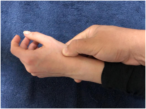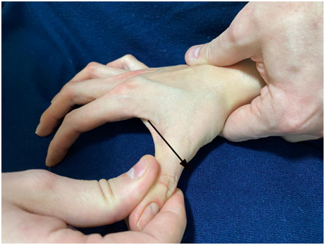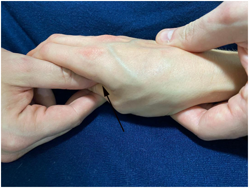 Figure 2 Digit-Pressure of the trapeziometacarpal joint (firm palpation is performed on the trapeziometacarpal joint).