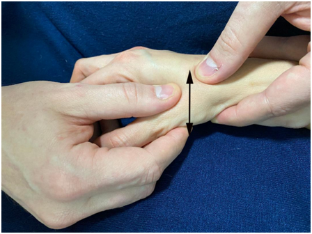 Digit-Pressure of the trapeziometacarpal joint (Figure 2): A firm palpation is performed on the back of the trapeziometacarpal joint. The test is considered positive when the patient reports pain in the trapeziometacarpal region.
